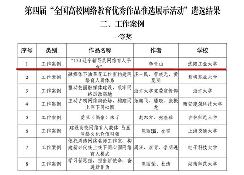 近日,由教育部思想政治工作司、中央網(wǎng)信辦網(wǎng)絡(luò)社會(huì)工作局聯(lián)合主辦的第四屆“全國(guó)大學(xué)生網(wǎng)絡(luò)文化節(jié)”和“全國(guó)高校網(wǎng)絡(luò)教育優(yōu)秀作品推選展示活動(dòng)”遴選結(jié)果公布,我校建筑與土木工程學(xué)院黨總支副書記、副院長(zhǎng)李青山老師撰寫的工作案例《123遼寧輔導(dǎo)員網(wǎng)絡(luò)育人平臺(tái)》成功入選并以全國(guó)第一名的成績(jī)斬獲一等獎(jiǎng),實(shí)現(xiàn)了我省在該項(xiàng)活動(dòng)中的新突破。