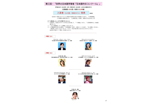 世界的日語學習者日語寫作大賽是世界規模的重要日語寫作賽事之一,旨在培養優秀日語人才,促進國際民間友好交流。本屆比賽共收到來自66個國家和地區的9086篇參賽作品,經過評審組專家的兩輪嚴格篩選,共評選出一等獎2人,二等獎5人,三等獎20人,努力獎30人。吳潮松同學是二等獎以上獲獎者中唯一來自中國大陸的選手。