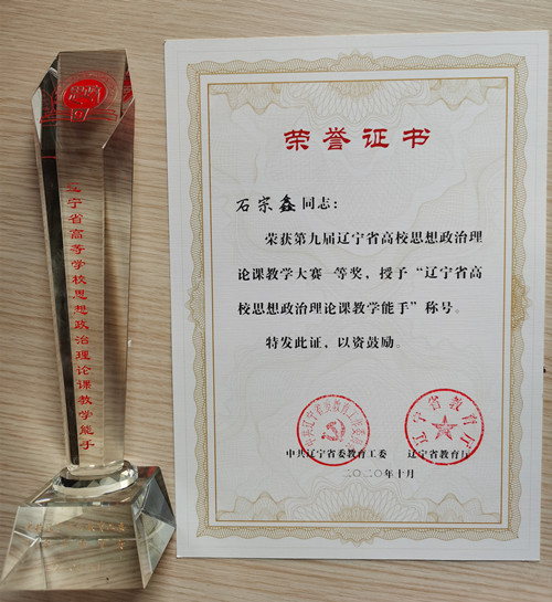 近日,在中共遼寧省委教育工委、遼寧省教育廳舉辦的第九屆遼寧省高校思想政治理論課教學(xué)大賽決賽中,我校馬克思主義學(xué)院教師石宗鑫不畏強(qiáng)手,發(fā)揮特長,經(jīng)過初賽、復(fù)賽、決賽三個階段的頑強(qiáng)拼搏,最終取得了一等獎的好成績。