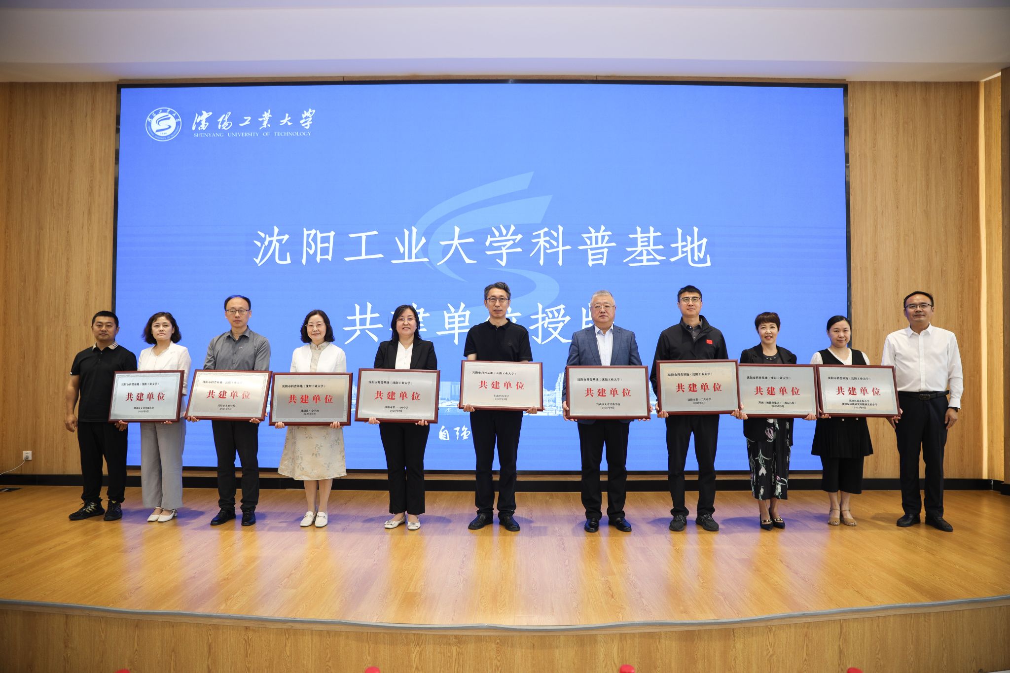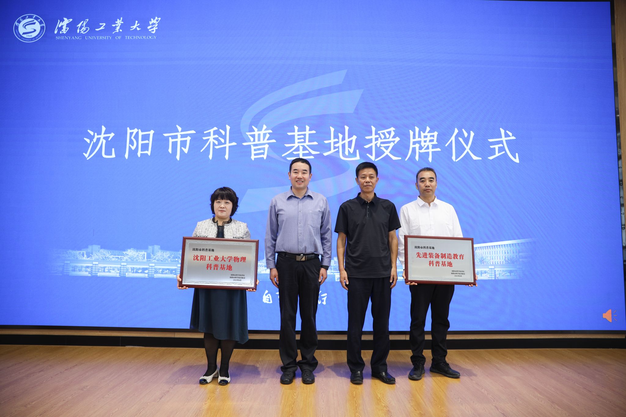 儀式上,鞠楠、趙宇為沈陽工業(yè)大學(xué)授予沈陽市“先進裝備制造教育科普基地”和“物理科普基地”牌匾。