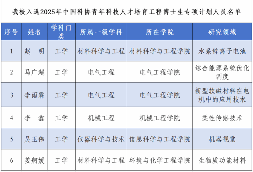 6名博士的成功入選是學校持續深化研究生教育改革、推進高質量博士研究生培養的重要體現。學校將以此為契機,進一步完善研究生培養體系,強化有組織科研與研究生培養協同推進,持續提升博士研究生創新能力和學術潛力,為研究生提供全鏈條科研支持、專業實踐平臺和個性化成長服務,助力研究生成長成才。