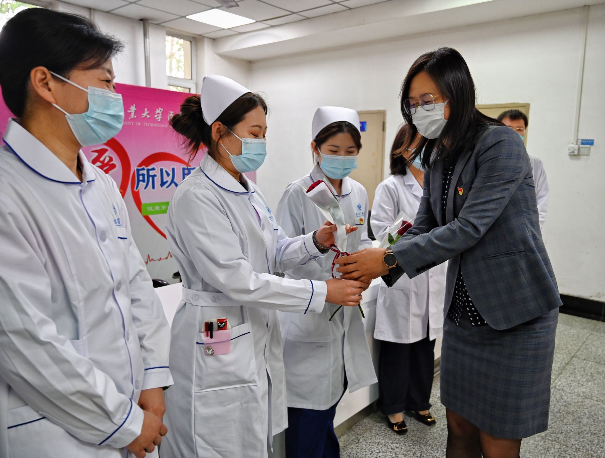 5月12日,在第112個國際護士節來臨之際,校黨委副書記趙璟一行前往校醫院開展護士節慰問活動,校工會常務副主席王永康隨行。