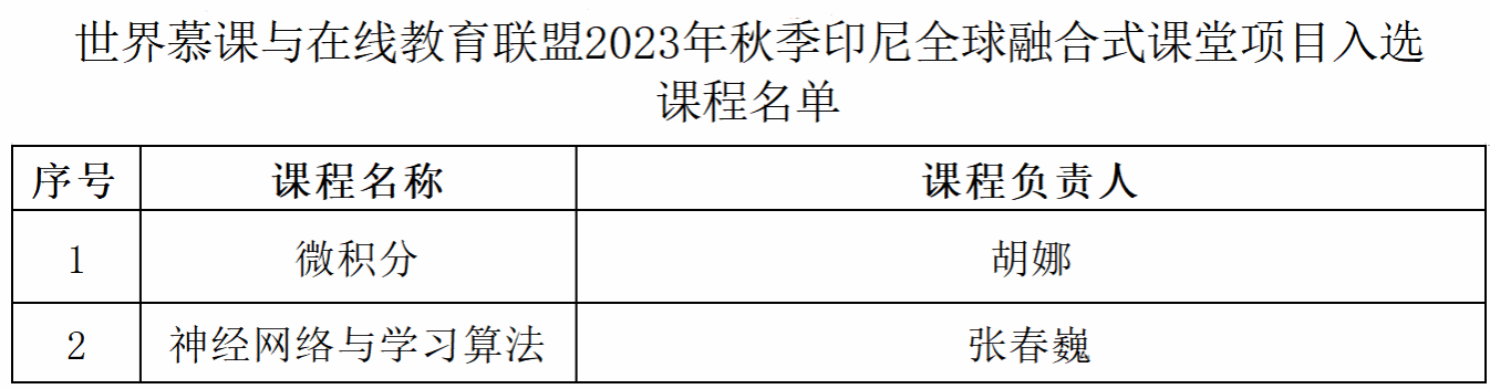 為貫徹落實國家教育數字化戰略行動,支持打造教育對外開放新高地,進一步深化拓展中國與印度尼西亞在高等教育領域的互利合作和交流互鑒,世界慕課與在線教育聯盟秘書處面向全國高校征集遴選向印尼高校開放的全球融合式課堂。我校《神經網絡與學習算法》《微積分》成功入選2023秋季印尼全球融合式課堂項目,該項目全國共有34門課程入選。這是繼學校4門課程實現慕課出海之后,我校優質教育資源全球共享的又一重要成果。